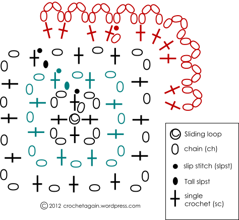 1. The diagram shows my adaptions, working it in rounds. The Bernat pattern is worked in rows instead. It is titled “Handicrafter Cotton – Dishcloth (crochet)” at Bernat. I had to log in to be able to view it from the link, but it took me right to it after I did.