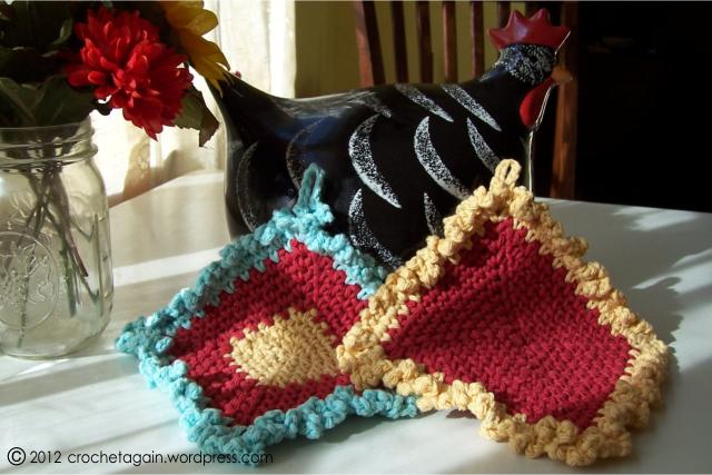 I used Bernat Handicrafter Cotton in Country Yellow, Country Red, Robins Egg and White, with a size E (3.5mm) hook.  I love the colors, fun, vintage-y and festive!  Maybe I will like washing up dishes more with pretty dishcloths (well, can’t make me like it worse, and maybe I will think crochet thoughts while doing them, which can only be good : )