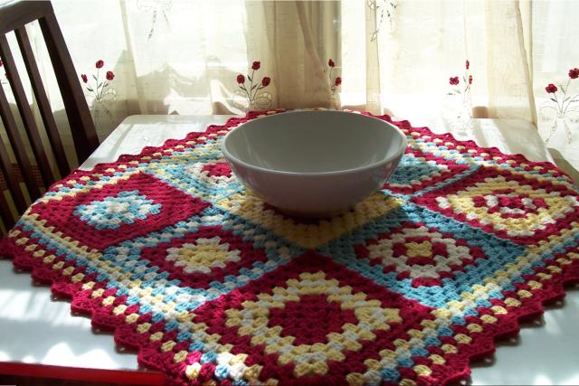 My table topper is almost finished, just need to do all the weaving in (I wish that was as easy as hiding them underneath for the photo : )  I really love how it came out.  The colors are so cheerful, a bright spot for morning coffee.