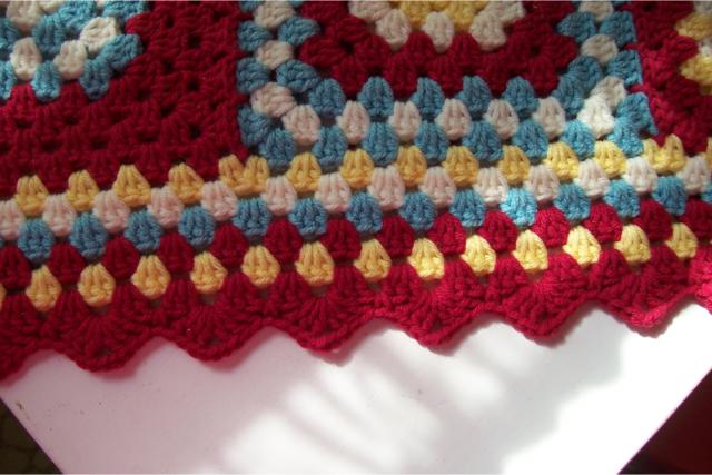 If you know how to do corners on granny squares, then you already know how to do the edging!  In the space between 3 dc, do the 3dc, ch3, 3dc that you would do for a corner.  Sc inbetween the next 3dc space.  And so on.  You need an odd number of 3dc spaces to have it work out right.  In the corner spaces, I did 4dc, ch3, 4dc to make them a bit bigger.