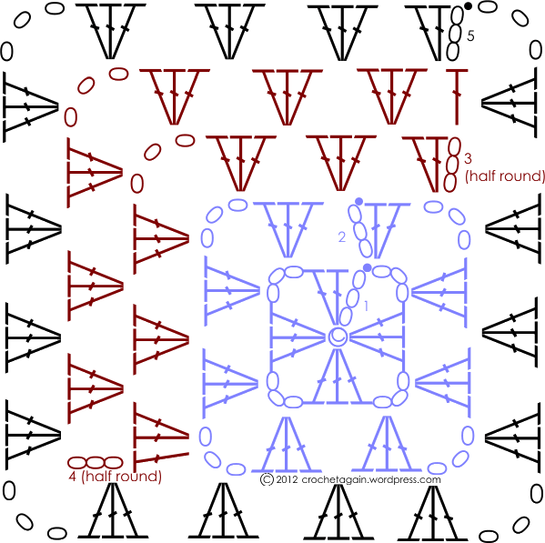 1/17/17: I have added a Granny Rectangle V2.0 diagram (at the end of this article). This one has ch2 corners and ch1 in between the 3dc’s, to show that version of granny squares.